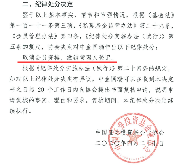 今年5月份,中国基金业协会就公布了对中金国瑞的纪律处分决定,其中详细陈述了中金国瑞存在的六大违法违规事实,并对该公司及其主要负责人作出了相关处分。对其作出“取消会员资格,撤销管理人登记”的纪律处分。